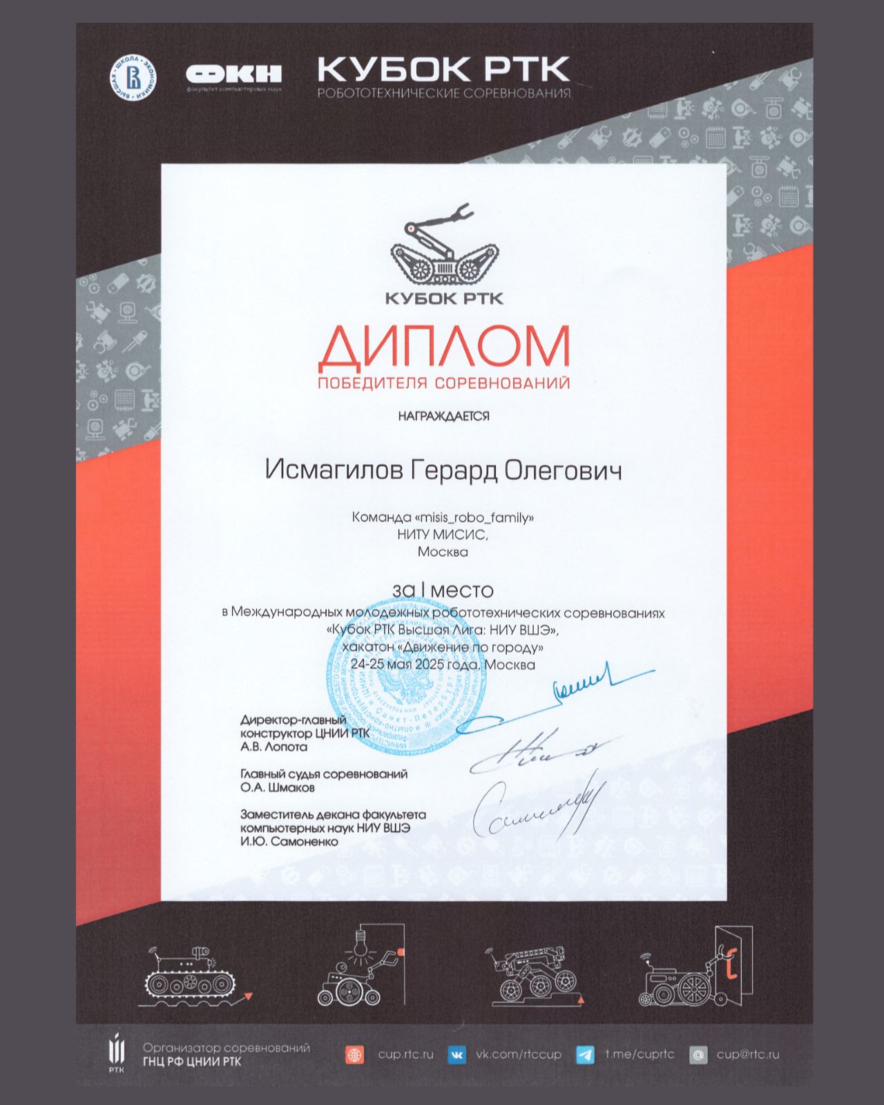 24-25 мая 2025 года в Москве прошли Международные молодежные робототехнические соревнования «Кубок РТК Высшая Лига: НИУ ВШЭ». В номинации «Движение по городу» Герард Олегович, выступавший в составе команды «misis_robo_family» (НИТУ МИСИС), продемонстрировал высочайший уровень профессионализма и качественно решил поставленные задачи.